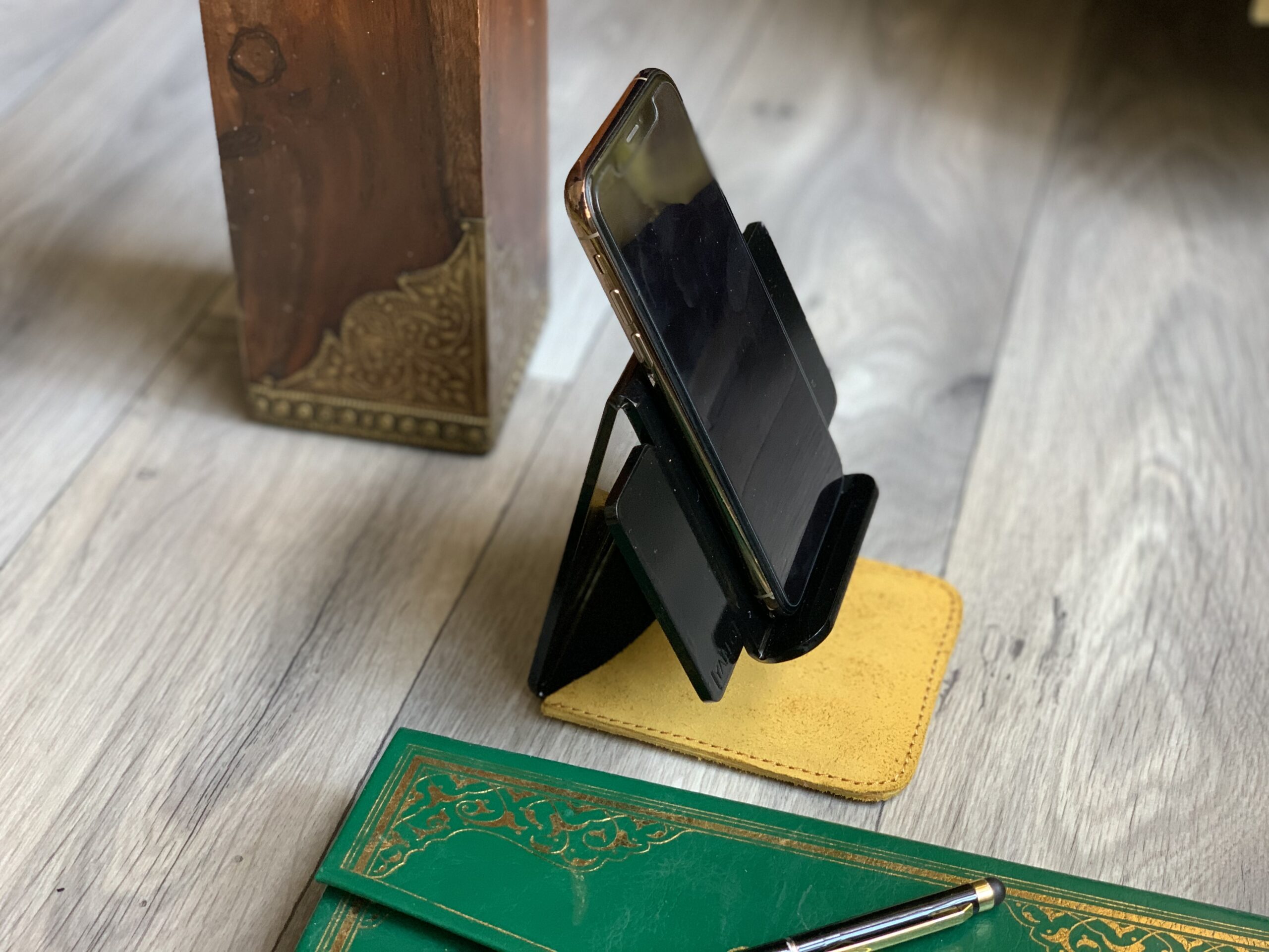 Sometimes you want to have that call while completing another task, it could be as simple as taking your cup of coffee while catching up with a meeting on call or taking notes from your online class. The Yallo phone holder is a stable dock for your phone that frees up your hands and has a great passport view of your face for video.  The desk-top accessory has wings on either side to accommodate different phone and tablet sizes, has a bottom opening that gives access to the charger port and comes with a leather base pocket that offers surface resistance to avoid movement and scratches while in use.